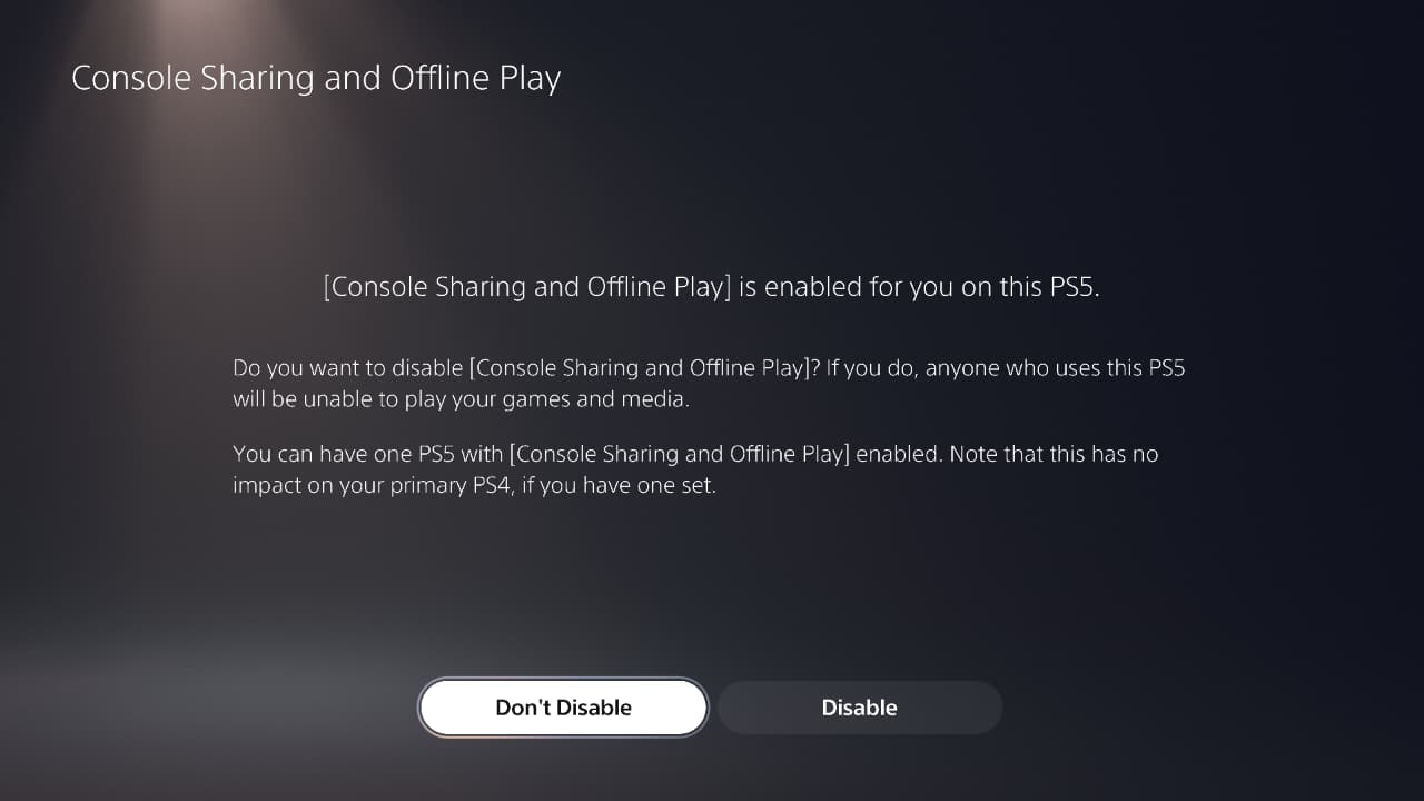 If the Console Sharing feature is already enabled, the prompt will ask you to disable it. With this, you can enable game sharing on your PS5.
